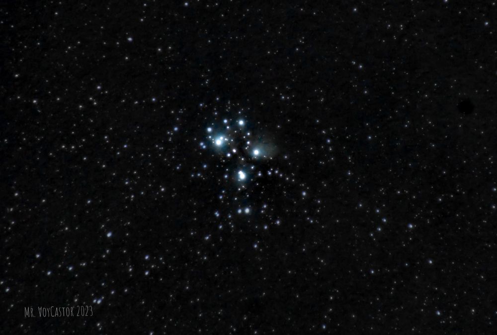 Astrophotography of the Pleiades in less than ideal weather. There weren't many clouds, but they were high and moving slowly. Some individual frames had light scatter from the Pleiades stars, as if in fog, even though there was none.