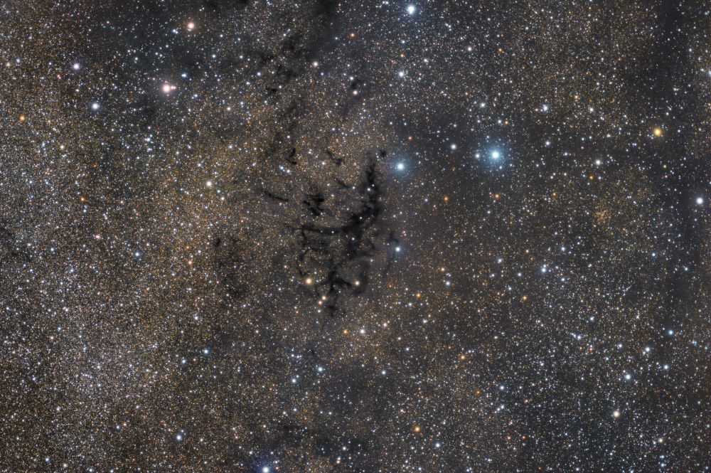 A cloud of dust with an intricate shape, located "to the right" of Altair, set against a relatively dark longitudinal band (the Aquila Rift), which divides the Milky Way into two parts in this region. The LDN 673 nebula is located approximately 600 light-years away from us.