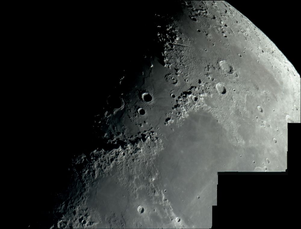 A lunar panorama from April 9th, composed of 3 frames. Captured with a 2x Barlow lens. Stacked 10% from 4,200 frames. Captured in SharpCap, stacked in AutoStakkert3, deconvolution in Astra Image 3.0SI, cropping in PIPP, panorama stitching in Microsoft ICE, post-processing in Photoshop. Exposure 33ms, gain 186.