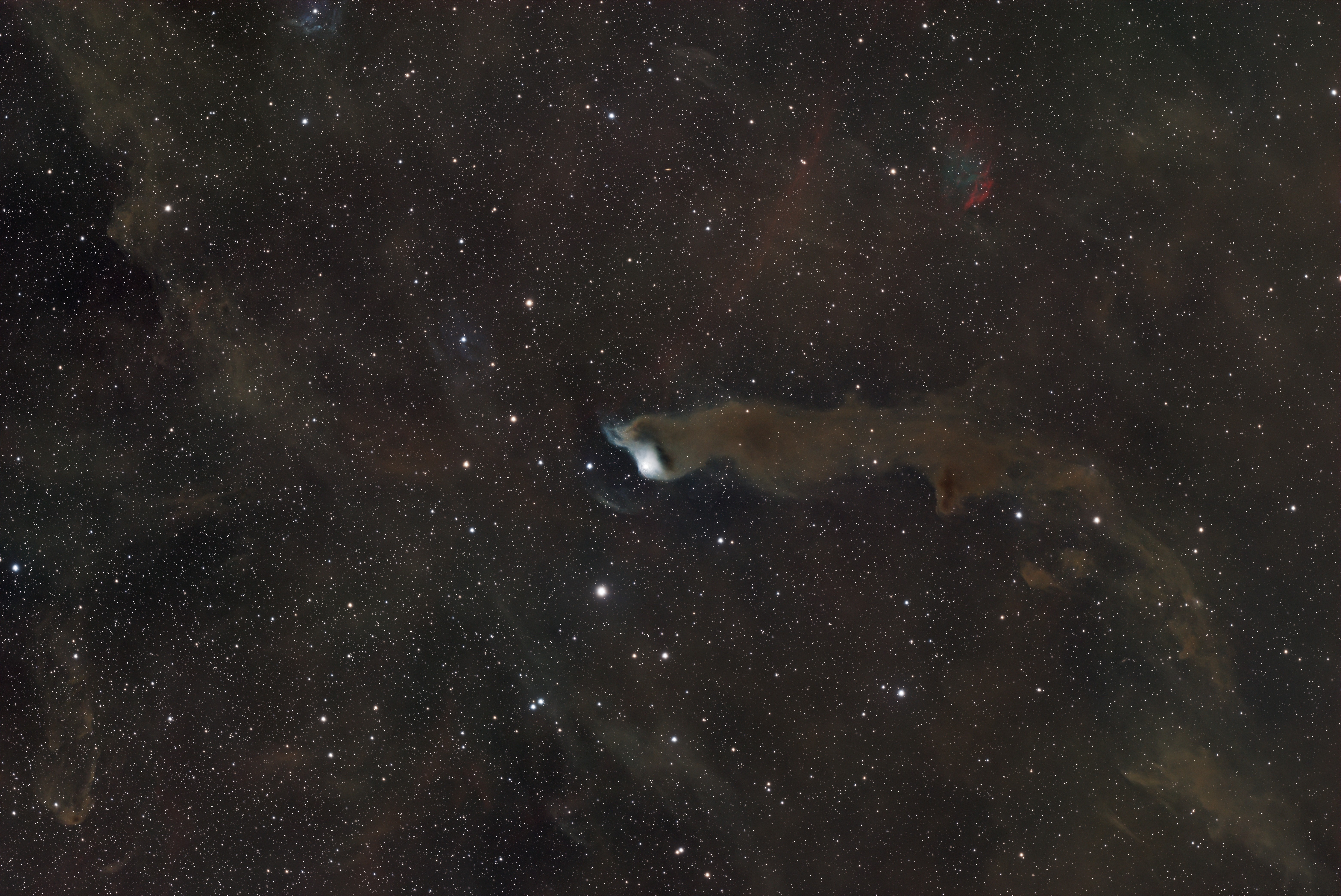 The reflection nebula VdB 152 (Barnard 175) and its dark gas-dust tail. This object is located in the constellation Cepheus, at a distance of about 1,400 light-years from the Solar System. A reflection nebula is a massive gas-dust cloud illuminated by the light of nearby stars, scattered by interstellar dust.