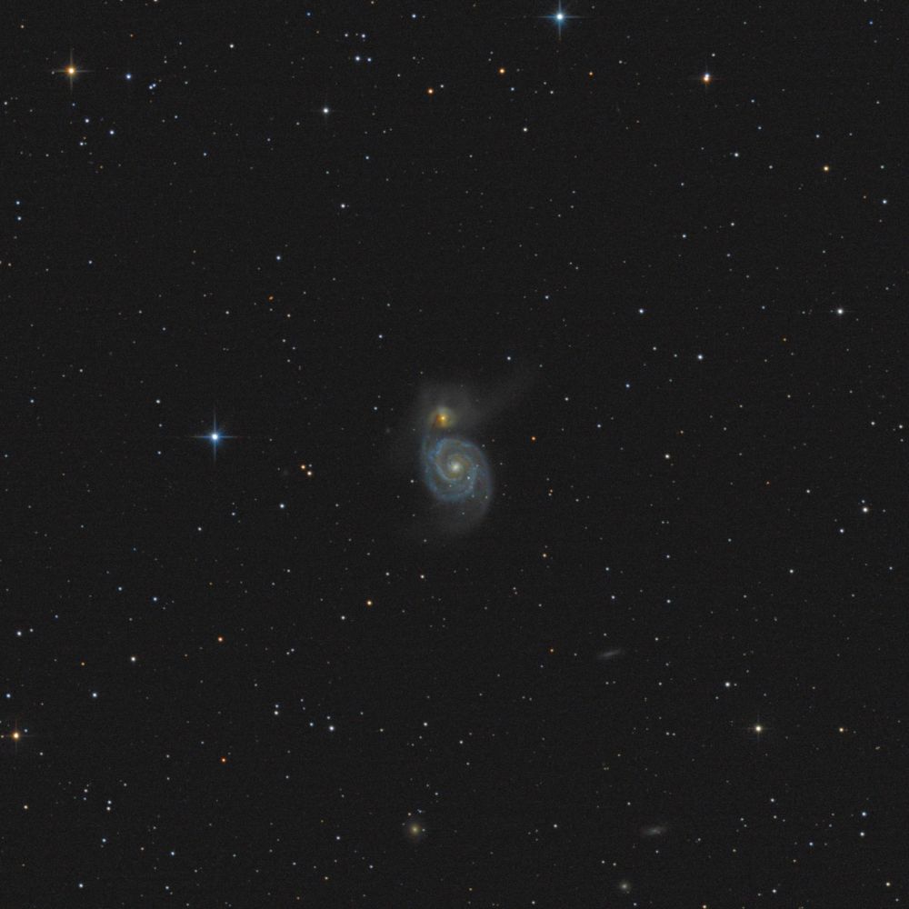 One of the most famous galaxies is M51, or the Whirlpool Galaxy, in the constellation Canes Venatici. This object is practically inaccessible from my balcony. So, the sessions were only half an hour each, over six nights in July and August 2020. The balcony is in Kharkiv, in a red zone of light pollution.