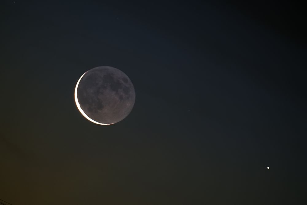 The Moon (phase 2.7%) at an altitude of 4.8 degrees, Mercury (phase 49%) at a distance of 1.6 degrees from the Moon.