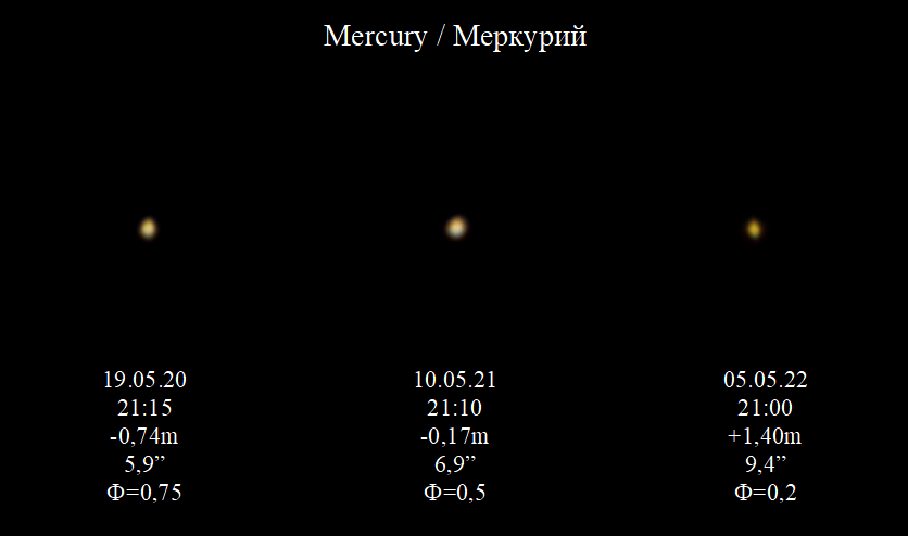 Mercury during evening visibility: May 2020, 2021, and 2022.