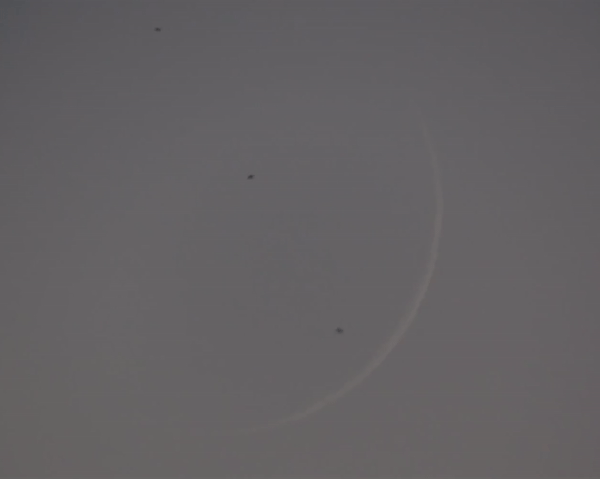 Three birds flying in front of a very thin 2.6% Moon. 30.06.23. Gif