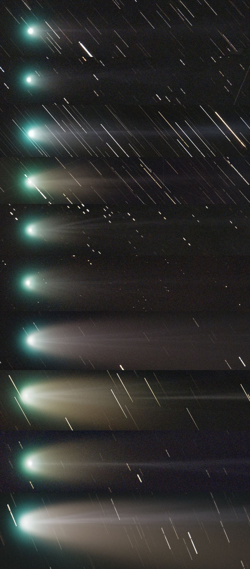 Evolution of the comet from September 28 to October 20. A total of 10 sessions were captured, and not all of them had clear skies—sometimes the Moon interfered, other times clouds rolled in...