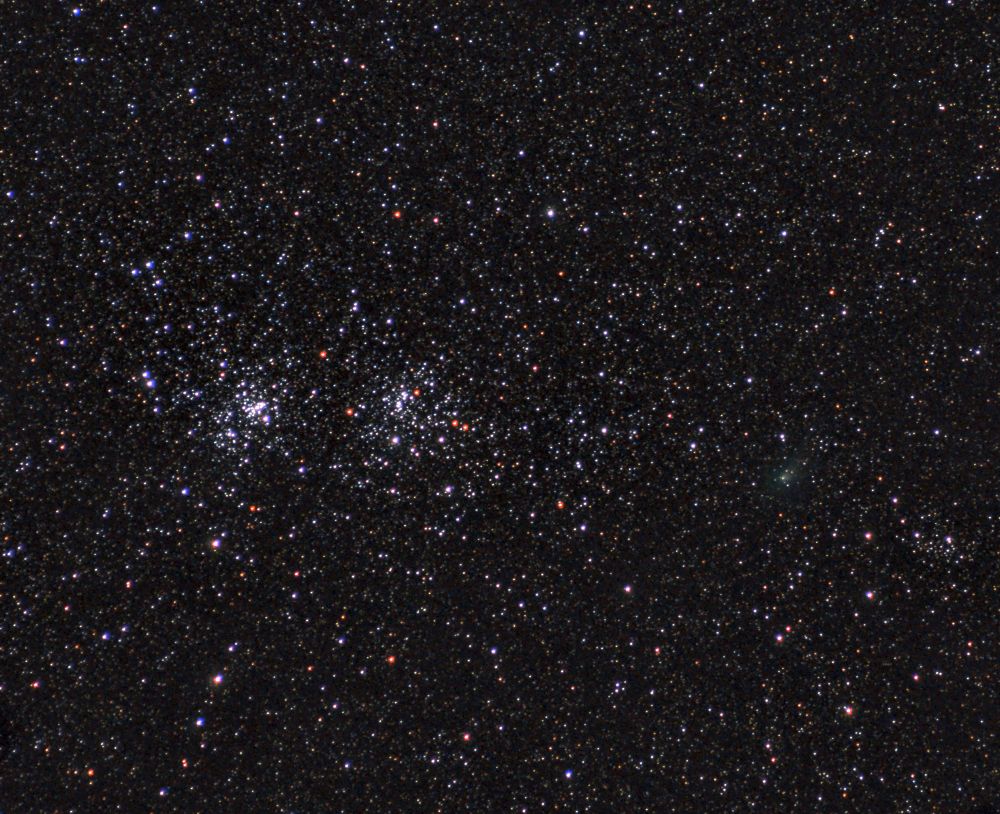 COMET C/2017 T2 (PANSTARRS) VERSUS H & X PERSEI ON 23.01.2020. Telescope/Lens: Sigma 70-300 APO f300/5.6 Camera: Nikon D5000 Mount: HEQ5PRO SynScan GoTo Software: DSS4.1.1, FITStackerV13, PhotoShopCC2014 Accessories: Bahtinov mask Narva, Estonia Exposure: 4 x 180" ISO/Gain: 800 Original size: https://deepskyhosting.com/7UjO8ka Author: Sergei Sankov
