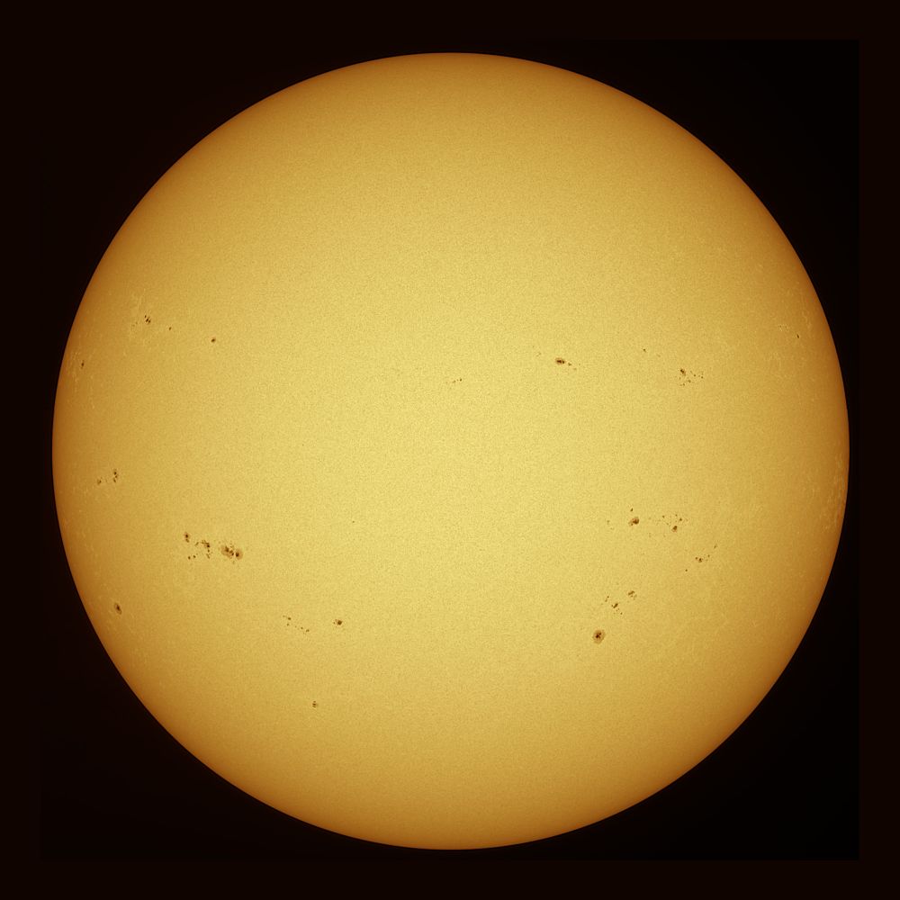Sun (photosphere) 17.07.2024 09:45 (GMT +5). Chelyabinsk, 4th floor balcony window. Celestron Advanced GT, Svbony SV503 80ED, SV305M Pro, film filter, Player One Photosphere 7.5 nm. Exp=5ms, Gain=150. SharpCap, AutoStakkert - 300/5000 frames, Photoshop (2-frame mosaic, color).