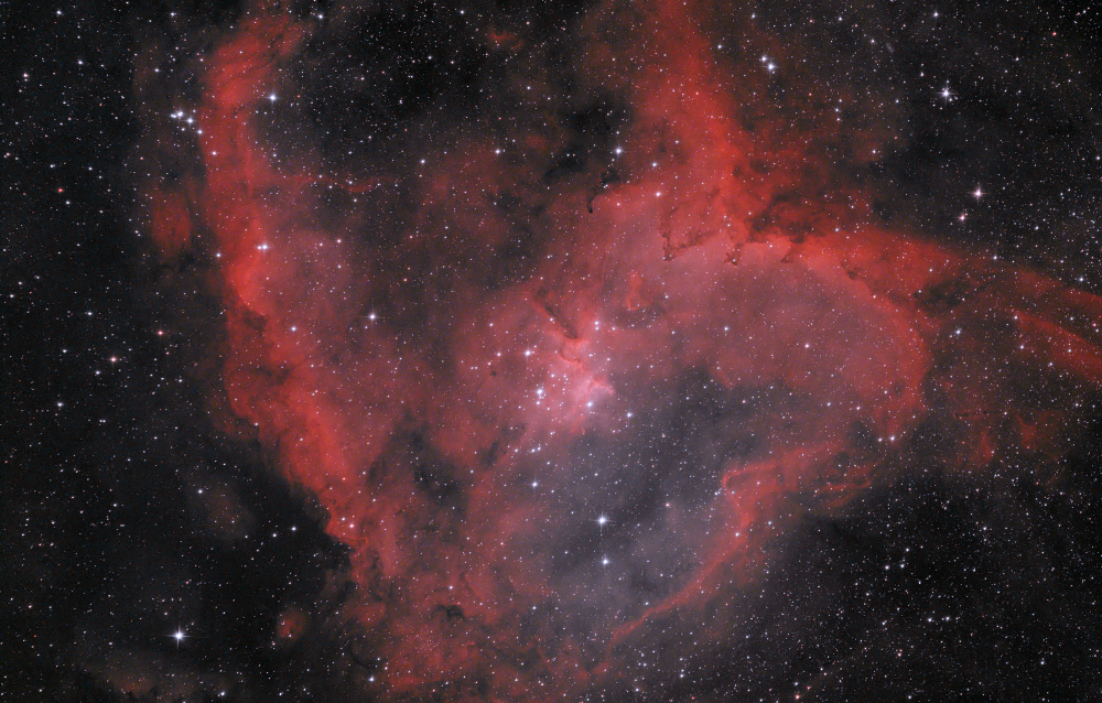 I spent a long time processing this object, trying many versions before settling on this one. Fragment of the Heart Nebula, IC 1805, S2-190 Mount: MT-90 Telescope: TS-Photon 8" f/4 Coma corrector: Starizona Nexus 0.75x Camera: ZWO ASI 2600mc Guide scope: 32x125mm mini guide scope Guide camera: ZWO ASI 178mm Filter: IDAS NBZ Total integration: 4.75 hours Date: October 17, 2022 Single exposure: 300 seconds Bin: 1x1, Sensor temperature: 0°C ISO/Gain: 100 Calibration: 30 darks, 30 biases, 30 flats Processing: FITStacker, PixInsight, Photoshop Sky brightness: orange zone.