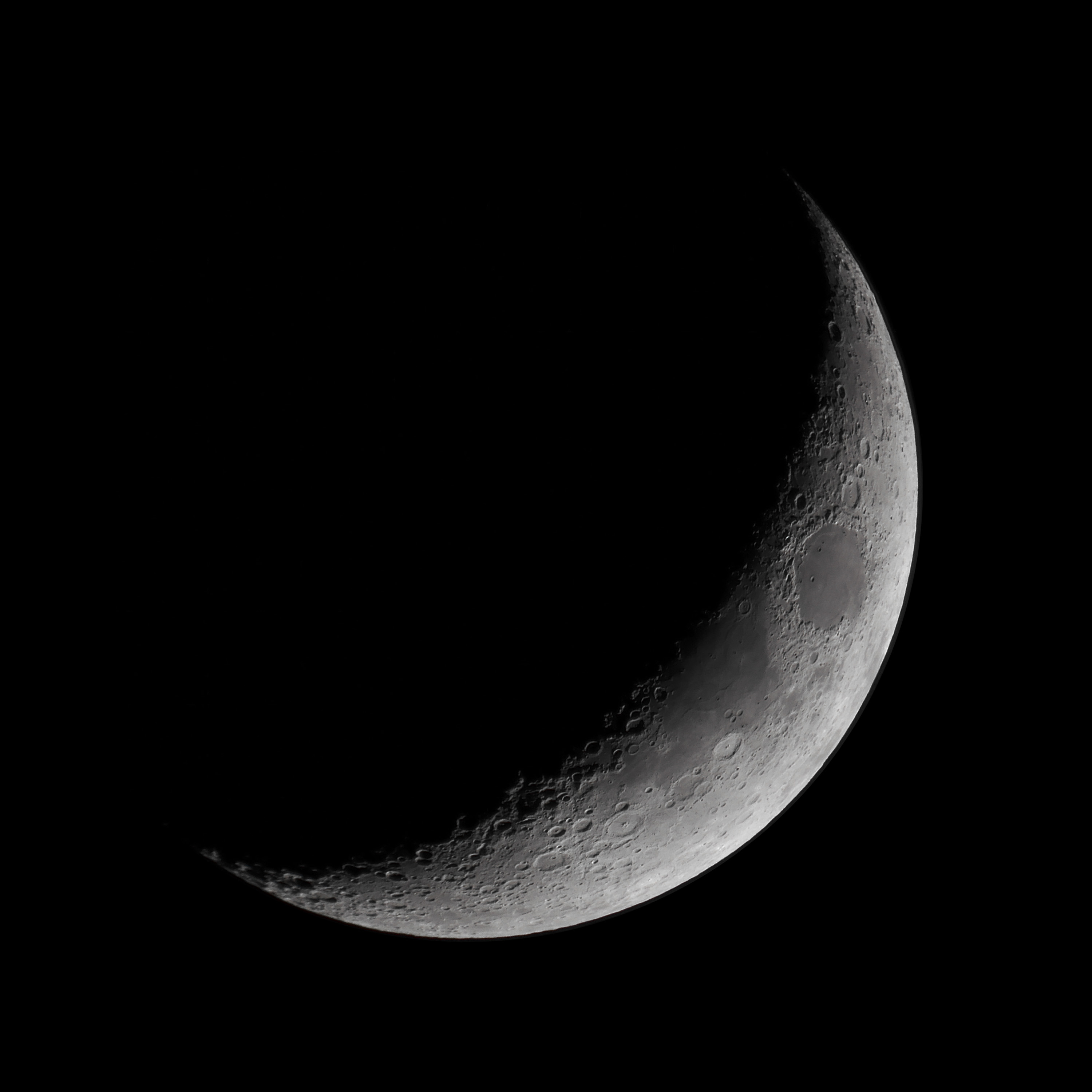 Young Moon (waxing crescent) 01.05.2025 22:30 GMT+5. Illumination 20.7%, altitude 24°. SvBony SV225 (AZ), SvBony SV503 102ED, lens block from Barlow 3x in T-ring, UV/IR-cut 2", Nikon D5100. PIPP, AutoStakkert - 10/30, Photoshop.