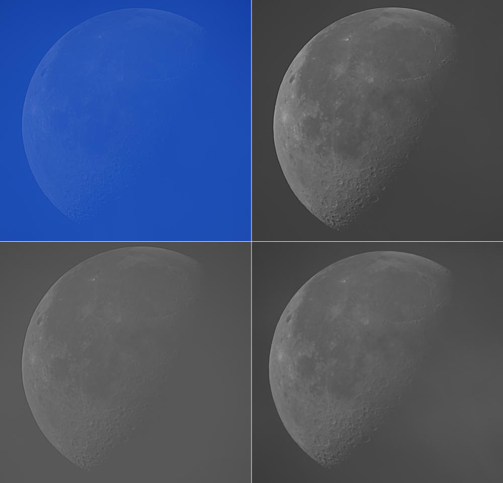 Daytime Moon photography (Phase = -63%) on 16.10.22 at 12:00 Moscow time using various filters: 1. Top row, left image in natural color: Moon Filter SvBONY, 500-frame video, ISO 160, 1/250 s. 2. Top row, right image in B&W: red filter, 500-frame video, ISO 640, 1/80 s. 3. Bottom row, left image in B&W: ultraviolet filter ZWB3 (UG5) Filter, 450-frame video, ISO 1270, 1/80 s. 4. Bottom row, right image in B&W: IR filter 685 nm, 400-frame video, ISO 5080, 1/80 s.
