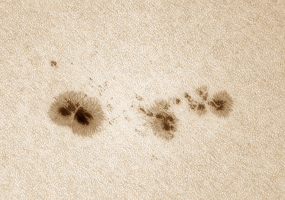 Sunspot Group 3423 from 10.09.2023. 15:51 Moscow time. Severnoye Tushino, balcony. Telescope LX 85 M6 (D-150 mm, f-1800 mm). Mount EQ-5 OnStep. Aperture filter with AstroSolar solar film. Camera ZWO 290 MM, red filter Exposure - 1.45 ms, Gain - 0 (0%), stacking 550 out of 6553 frames (1 min video). Processing in AS, AI 3.0SI, Ps.