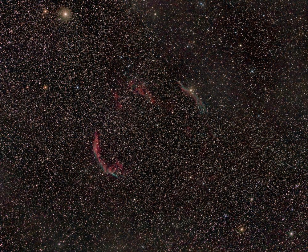 The supernova remnant in the constellation Cygnus is the giant diffuse Veil Nebula, consisting of several parts: 1) On the right, the Witch's Broom Nebula or Western Veil (NGC 6960, LBN 191) 2) On the left, the Fishnet Nebula or Eastern Veil NGC 6995 and NGC 6992 3) In the center, Pickering's Triangle Nebula NGC 6979 Above is the star Gienah ε Cygni (ε Cyg)