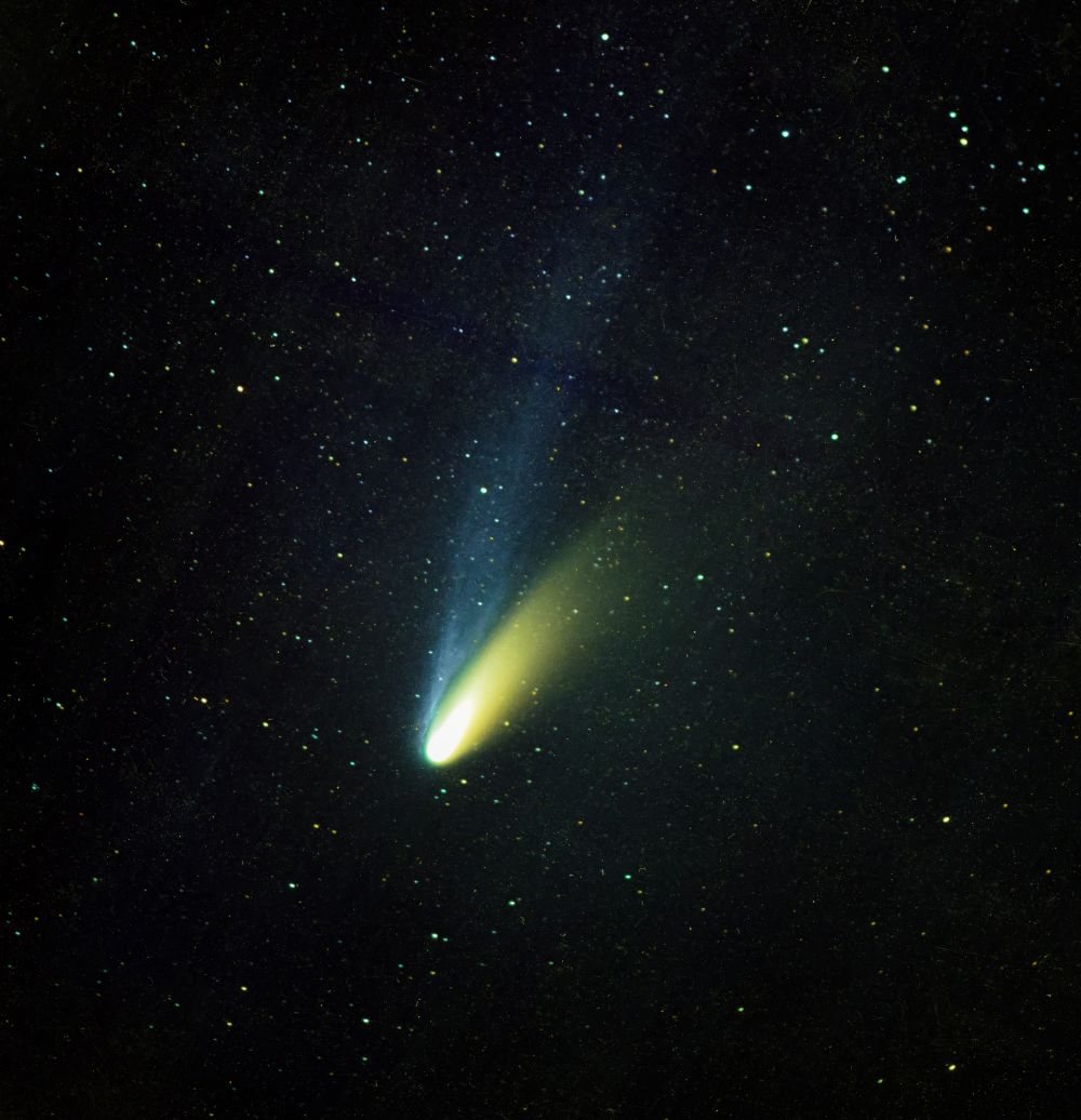 Comet Hale–Bopp, photographed on March 11, 1997 at 21:10, Tula. Lens "Jupiter-36B" with camera "Kiev-88", mounted on telescope "Mizar" (Tal-1) for possible manual guiding, exposure 20 min, Kodak 400 film, photo scanner (dust, etc.), negative not preserved, processed in Lr.