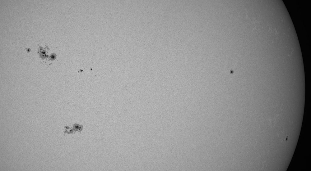 Sunspot groups on the morning of 30.05.2025 at 08:59 UTC+5. From left to right, top to bottom - 4100, 4101, 4096, 4099, 4092. SvBony SV503 102ED, Celestron Advanced GT, film aperture filter, Player One Photosphere 7.5 nm 540 nm filter, SvBony SV305M Pro - 5ms gain 180. AutoStakkert - 150/3000 fr, Photoshop.