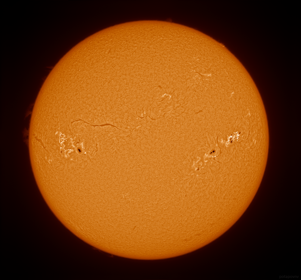 THE SUN Telescope/Lens: Coronado SolarMax II 60 BF10 Camera: ZWO ASI 178MM Mount: Sky-Watcher AZ-EQ6 Pro Software: PIPP, AutoStakkert, RegiStax5, Photoshop Balashiha, Russia Sunspot groups 2981, 2978, 2976, 2975 Original size: https://deepskyhosting.com/CLKH0cy Author: Nikopo