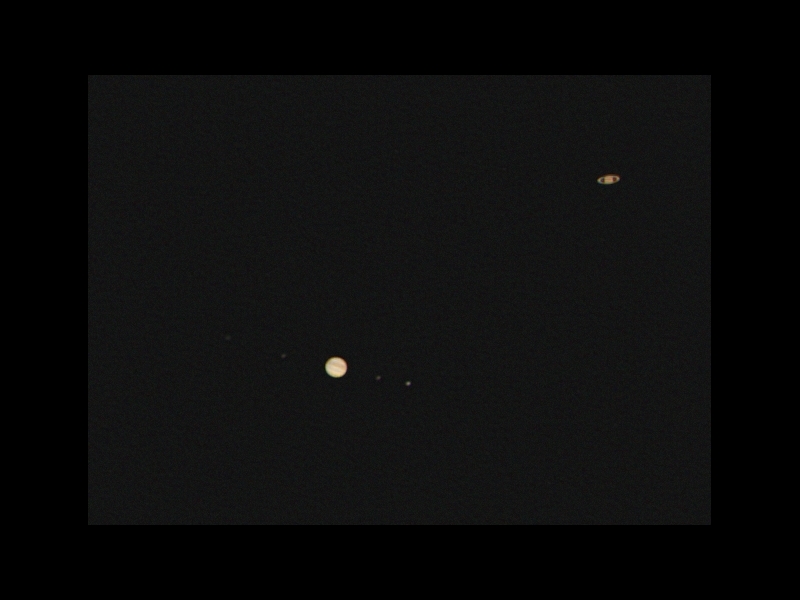 Conjunction of Jupiter and Saturn, December 22, 2020. This result was obtained by processing three 30-second video clips with different exposures—for the moons (1/60), for Jupiter (1/1000), and for Saturn (1/250). The final HDR composite was assembled in Photoshop. Taken from a balcony in Kharkiv, a red zone of light pollution.