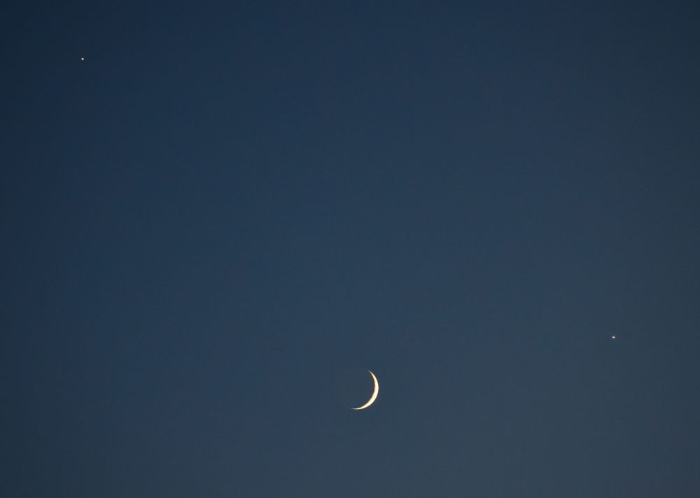 An interesting close approach of the Moon (Phase = +7.7%), Venus, and Jupiter.