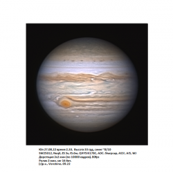 Юп 27.08.22 время 2.33 SW25012, Neq6, ES 3x, f3.6м, QHY5III178C, ADC. Sharpcap, AS3!, AI5, WJ, PGMania Юп высота 33 грд, сиинг ~8/10, 10000 кадров, 80fps Ролики по 2 мин, ser 16 бит, деротация...