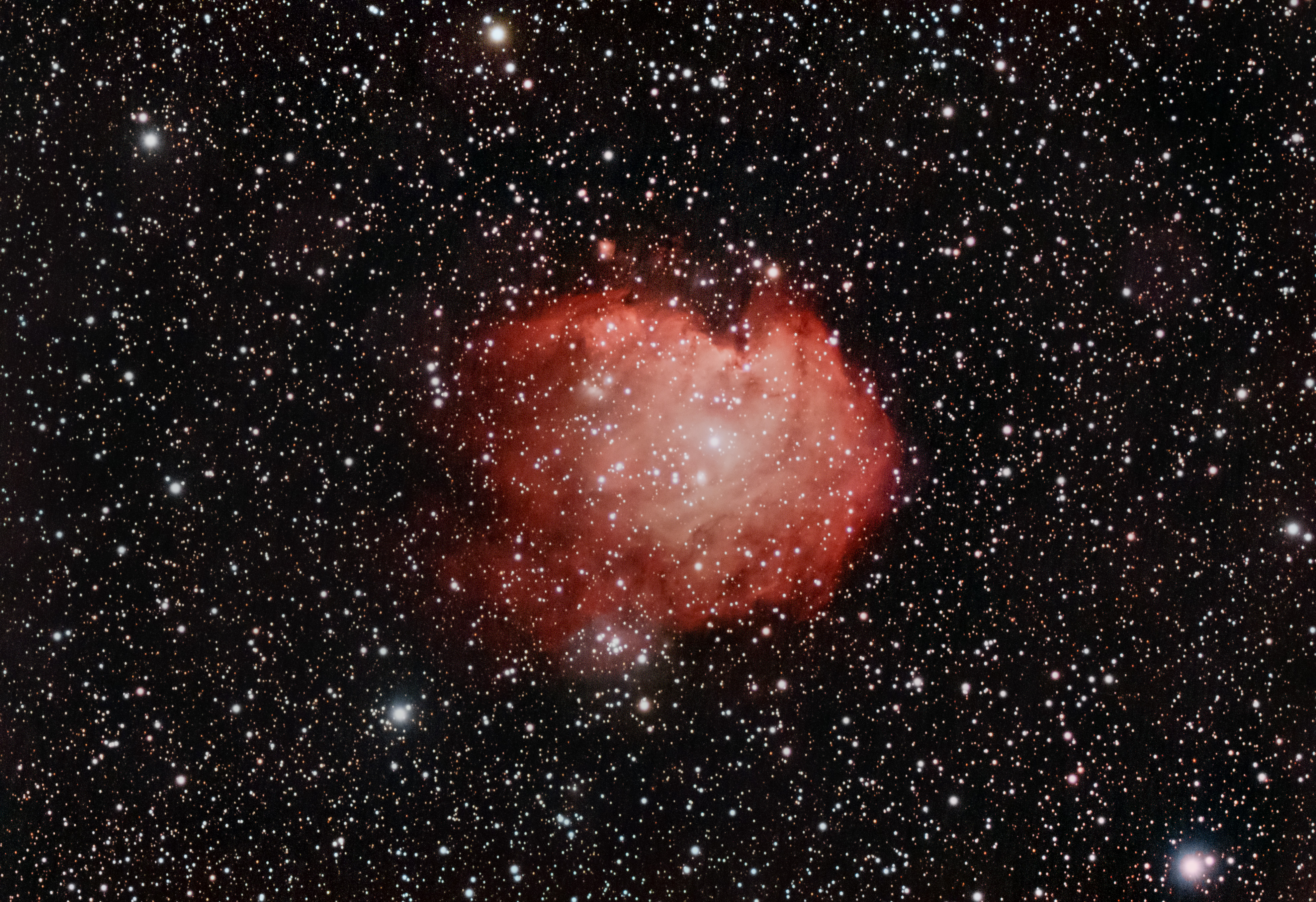 Monkey Head Nebula (or NGC 2170) is a bright emission nebula located in the constellation Orion. It got its name because on early astronomical images it resembled a monkey's head. The nebula is located at a distance of approximately 2.4 thousand light years from Earth. It consists of gas and dust that glow due to ultraviolet radiation from stars located inside or near it. Inside the nebula, processes of new star formation are taking place.