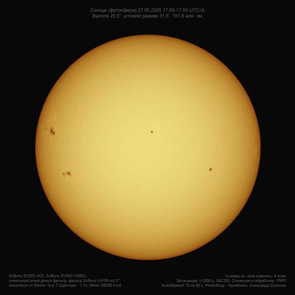Sun at the beginning of the day - 17:55 UTC+05 27.05.2025. Altitude 25.5°. SvBony SV225 (AZ), SvBony SV503 102ED, film aperture filter, SvBony UV/IR-cut 2", lens block from Barlow 3x in T-ring (1.7x), Nikon D5000 mod. Exp=1/1000 s, ISO 200. PIPP, AutoStakkert 15/60 k, Photoshop.