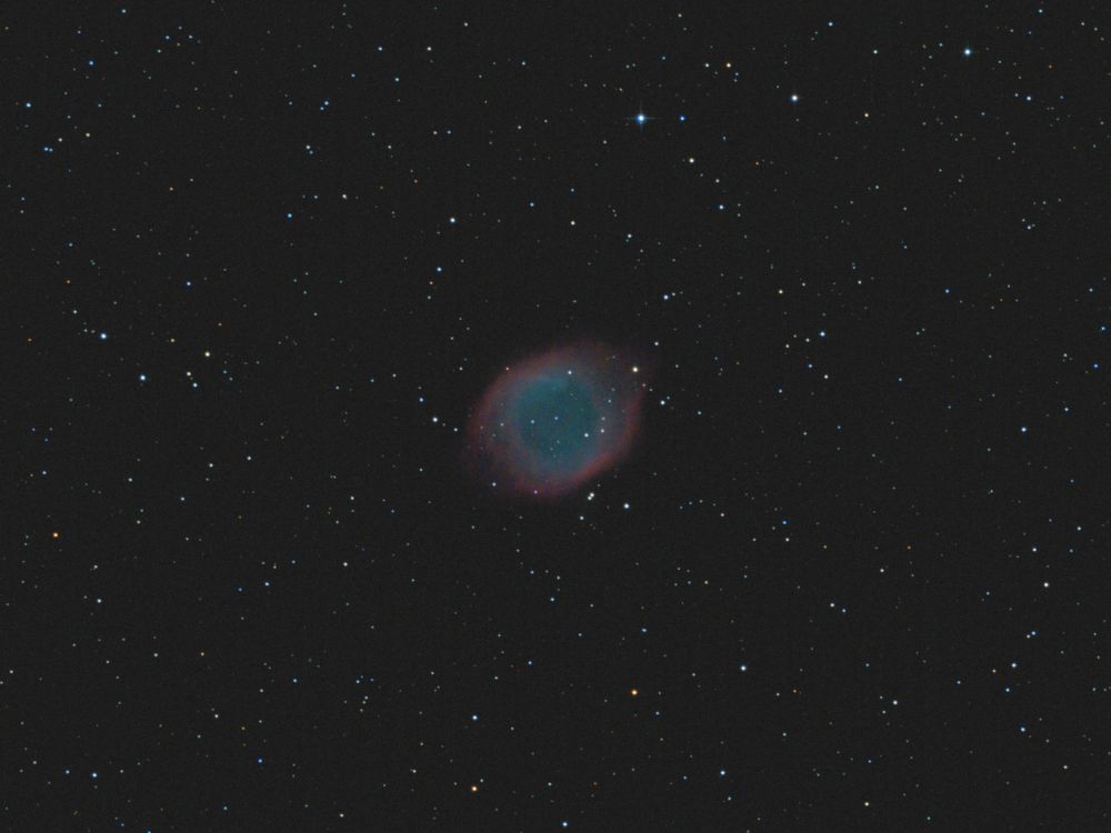 One of the largest planetary nebulae, the "Helix Nebula." Its angular size is nearly half that of the Moon's disk, yet it has low surface brightness and is observed low above the horizon at mid-northern latitudes. During imaging, its altitude was about 15 degrees, just above a double streetlight: https://deepskyhosting.com/ivFNOMk