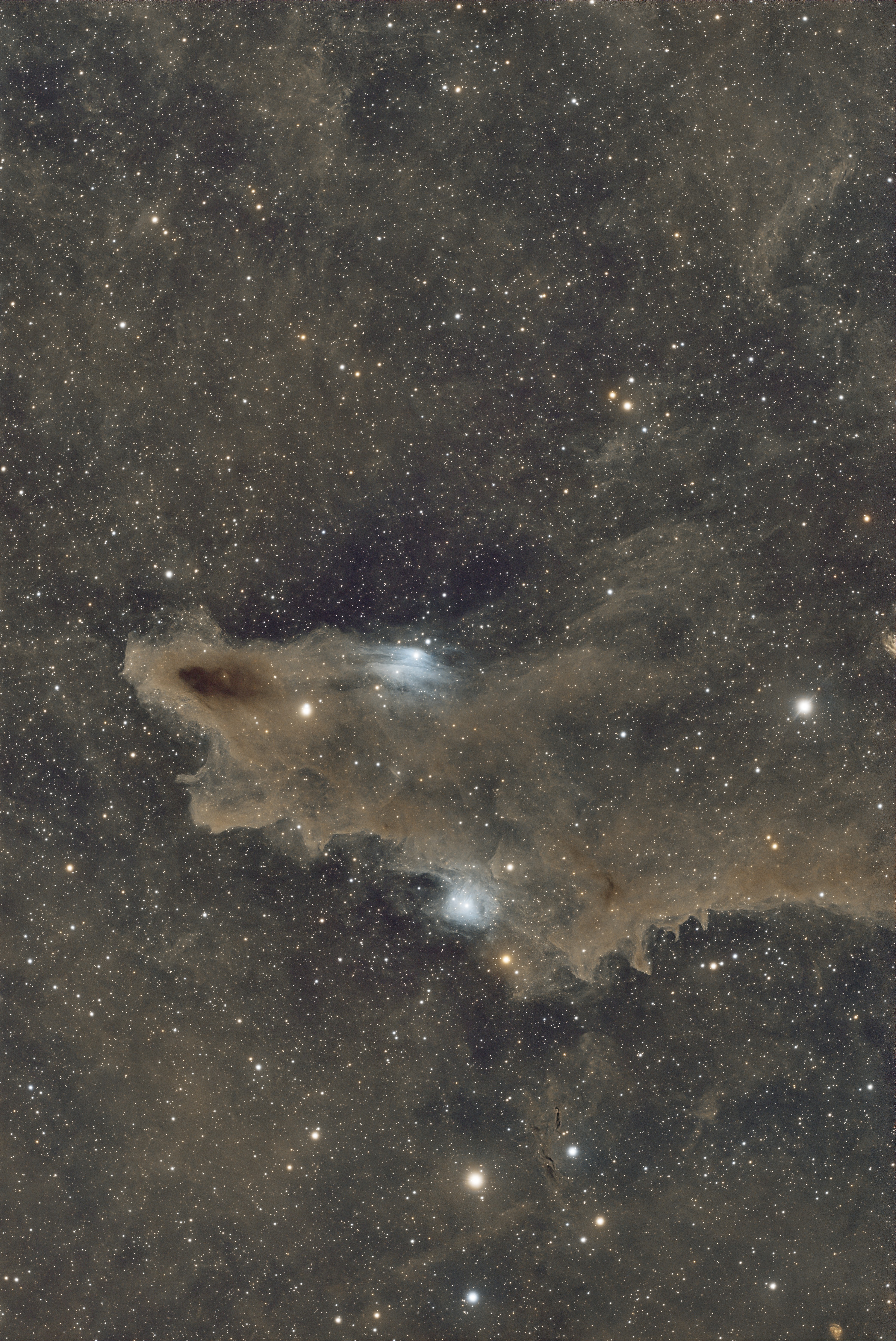 LDN 1235 is the Shark Nebula. It consists of interstellar gas and dust and appears as a dark cloud resembling a shark against the background of the starry Milky Way. The size of the nebula is about 15 light years. It is located 650 light years away from us and is in the constellation of King of Ethiopia (Cepheus). Imaging was conducted on 30-31.08.2025, 29-30.09.2025 in the Moscow region. Total integration 7 hours 00 minutes (300sec frames).