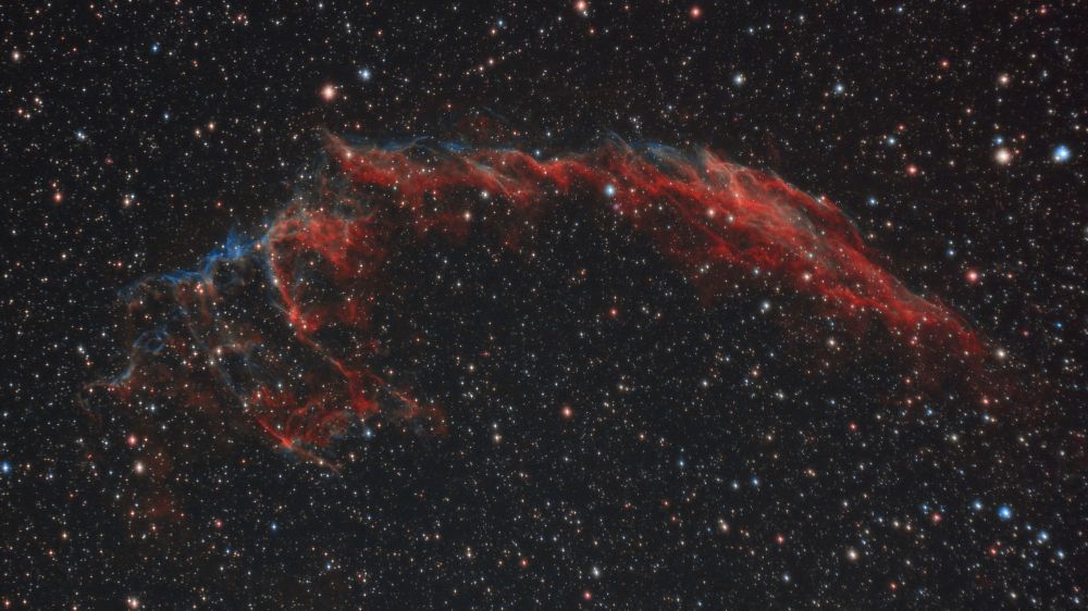 The Veil Nebula, also known as the Cygnus Loop or the Witch's Broom Nebula, is a diffuse nebula in the constellation Cygnus. It is a vast and relatively faint supernova remnant. The star exploded approximately 5,000 to 8,000 years ago.