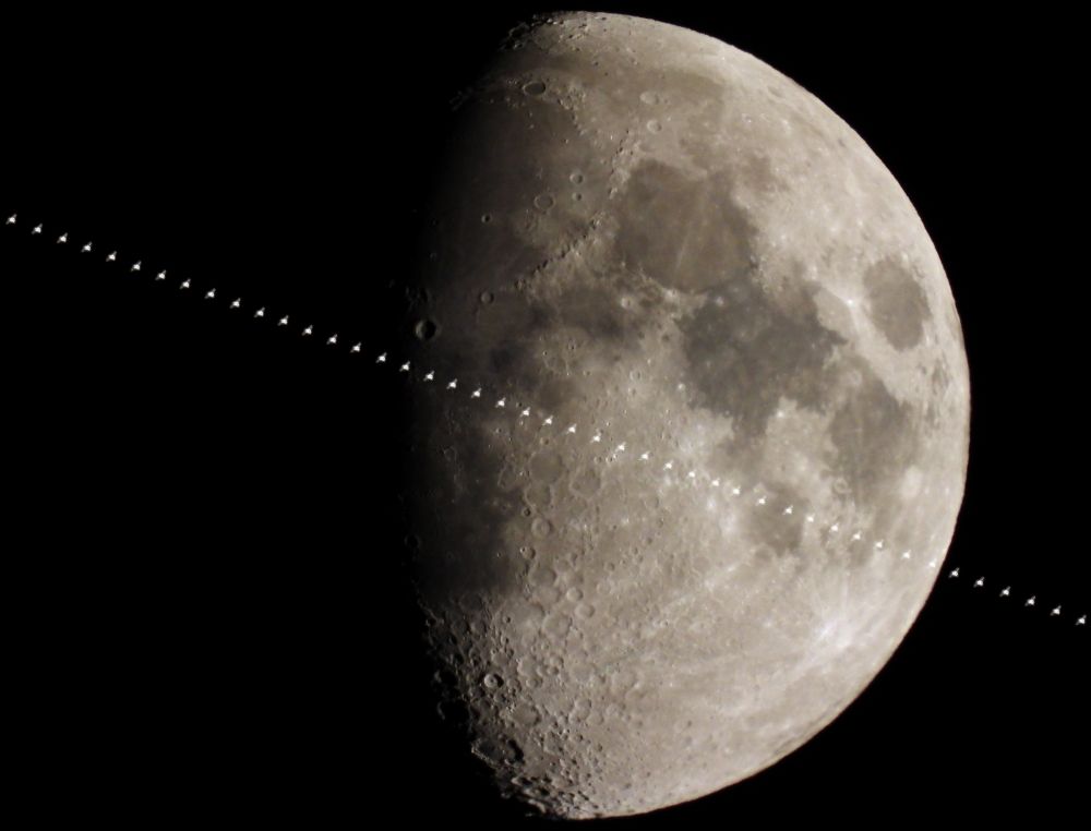 Collage of processed material (ISS transit across the Moon), for the transit path across the center of the disk Original video: https://vk.com/video131500382_456239405 Light photo tripod, Nikon P1000 superzoom, at 3000 mm focal length, 4K video, 30 fps, inverse Fourier transform for linear blur correction