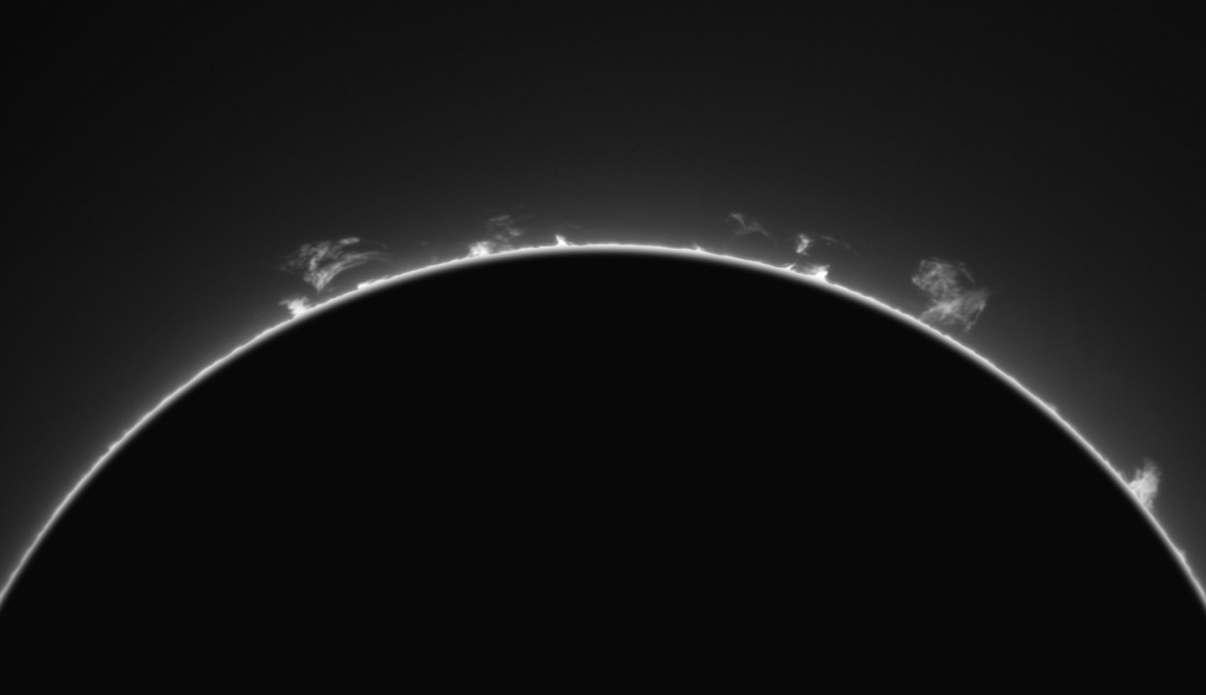"Dances" of prominences in monochrome... 09:11-11:45 UTC+05 July 7, 2025 - Lunt 40 mm (LS40THa/B500), Svbony SV305M Pro + Barlow lens block 3x.