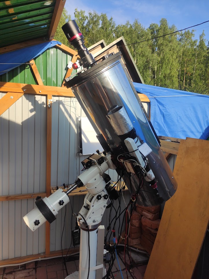 Igor Gribko's mirror, stainless steel tube 0.5 mm, reinforced with rings made of 18 bakelite plywood inside, mirror cell made of aluminum and also plywood. Front end in Lanikea style by Oleg Chekalin. The weight turned out to be 15.5 kg without the camera and corrector. In the photo, it's still without an electric focuser, now installed.