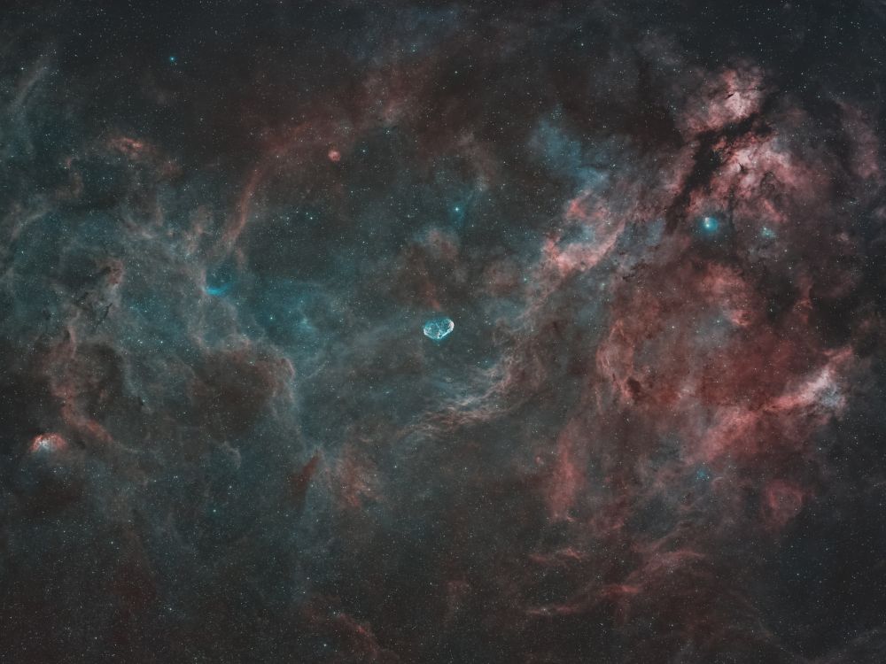 Yes, I understand. The Soap Bubble Nebula (PN G075.5+01.7) isn't visible even on the original stacked image. Additionally, my oxygen filter data is out of focus, so only the brightest details in it have come through.
