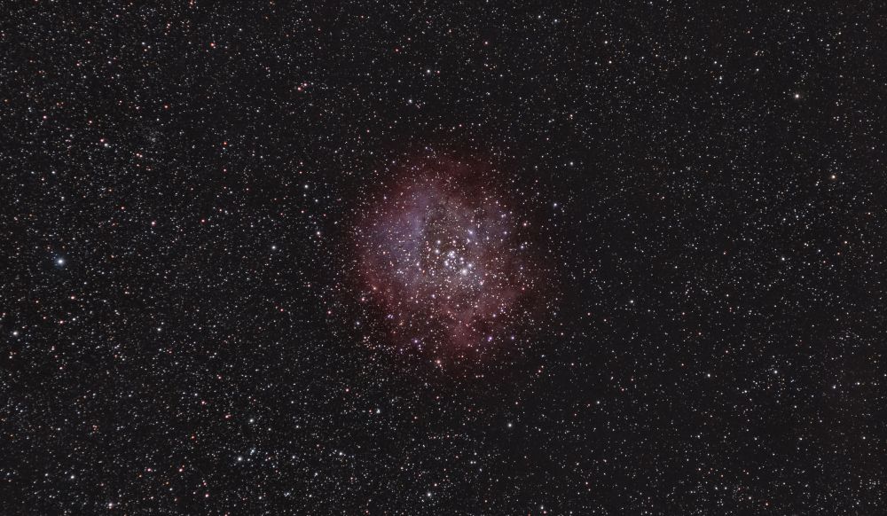 NGC 2237 Rosette Nebula A giant emission nebula located near one of the large molecular clouds in the constellation Monoceros. It is a region of ionized hydrogen where star formation is taking place. At the center of the nebula lie the bright blue stars of the open cluster NGC 2244. Discovery date: 1871 Distance: 5,200 light-years Diameter: 130 light-years Apparent dimensions: 80′ × 50′