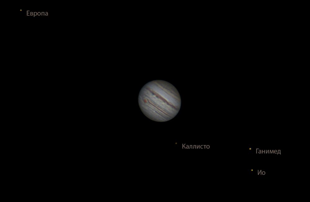 JUPITER AND ITS MOONS Telescope/Lens: Sky-Watcher 2001 Camera: ZWO ASI120MC-S Mount: SW EQM35pro Software: SharpCap, PIPP, AutoStakkert, RegiStax, Adobe Photoshop Accessories: 2х Барлоу GSO ахро. P Preobrajenie, Russia A video was captured with a duration of about 100 seconds. 20% of the frames were stacked. Original size: https://deepskyhosting.com/KKMCNat Author: Aleksandr