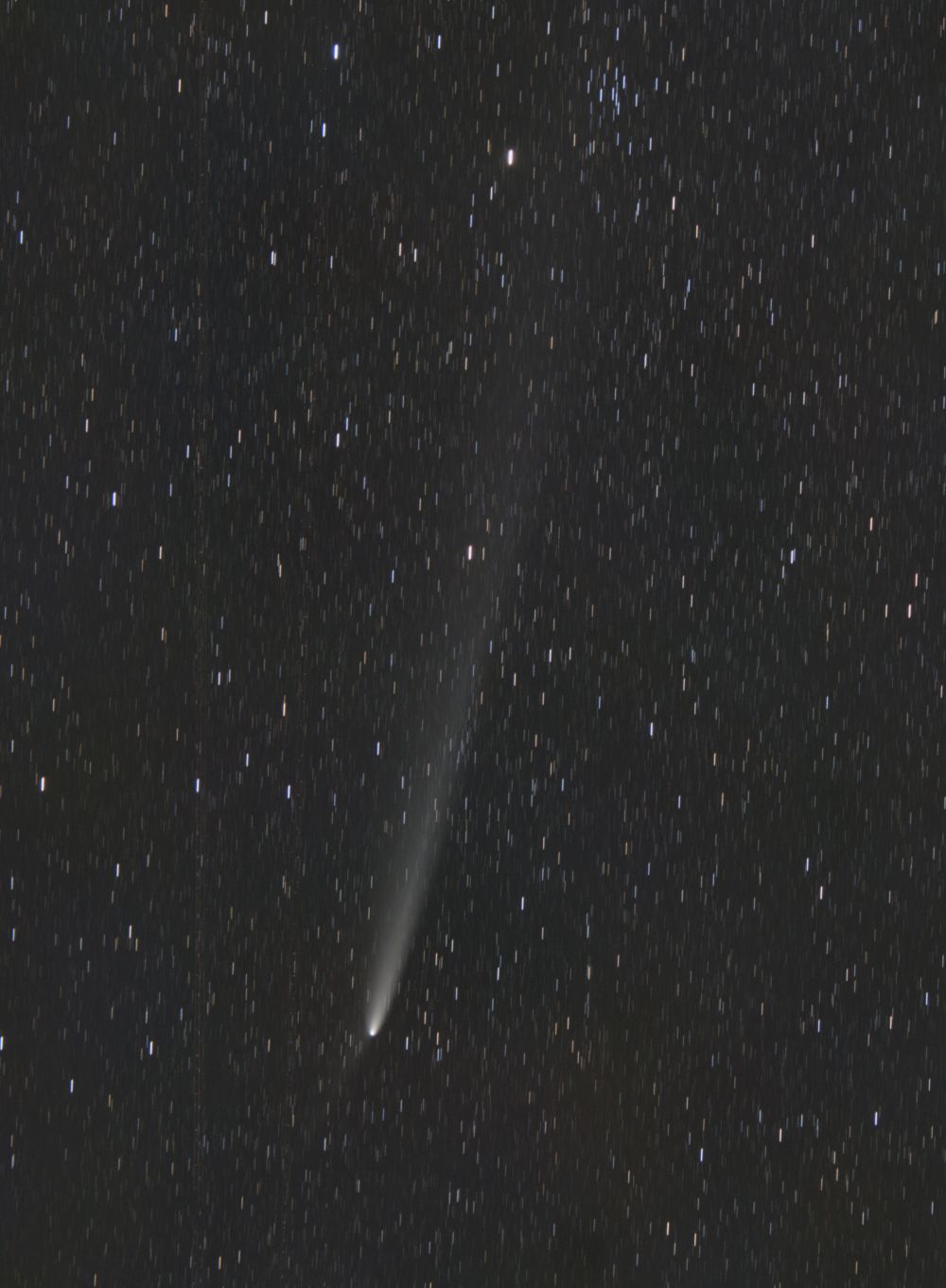 Finally managed to observe the comet. It was very well visible to the naked eye and even its tail was visible, despite the fact that it has long since passed its maximum brightness. I specifically went to the observatory for it. Unfortunately, the wires got in the way and I had to crop the sides. I used a mount as an astrotracker.