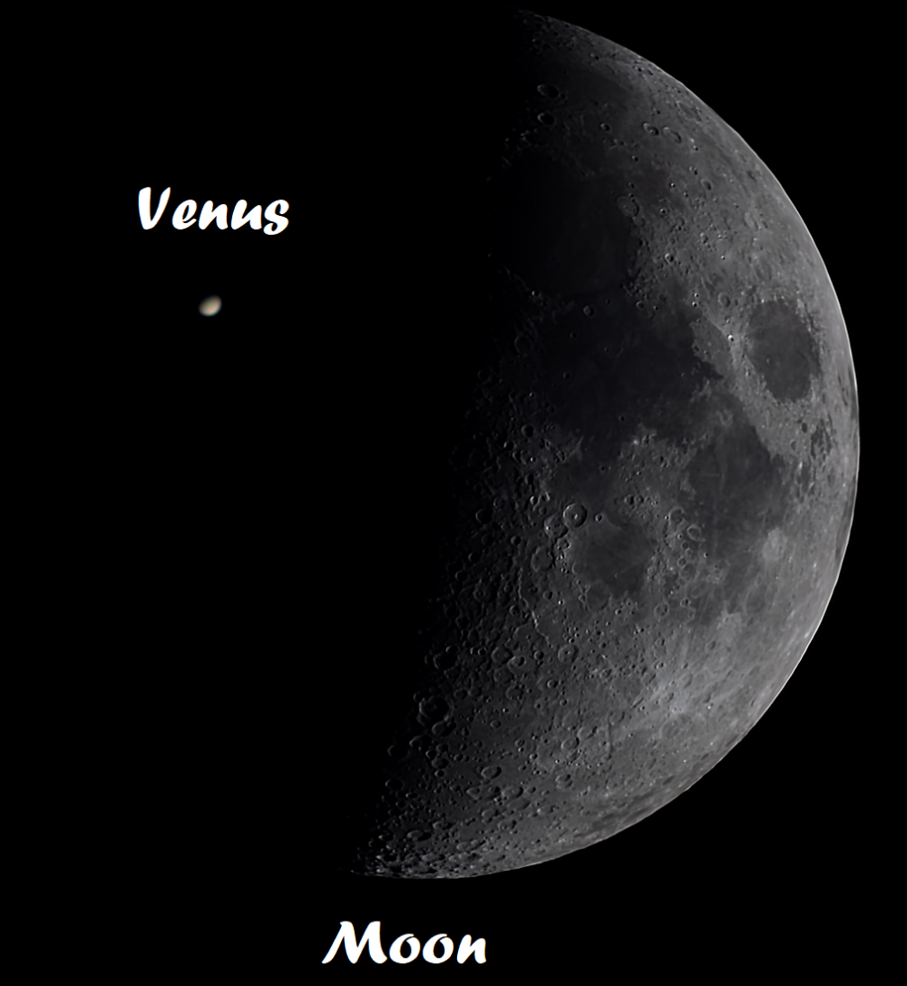 The Moon and Venus on the evening of March 28, 2023. Not to scale!
