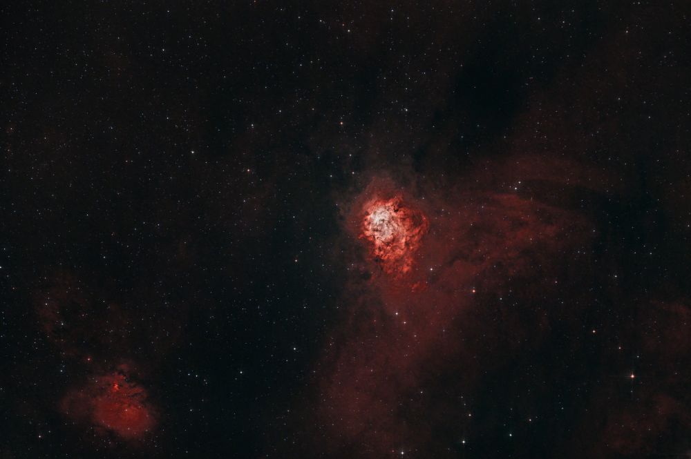 NGC 7538 is a star cluster surrounded by an emission nebula. The distance to it is about 7900 light years. The nebula consists mainly of hydrogen gas, but also contains cosmic dust, which glows brightly in the far infrared spectrum. With a total mass of about 400,000 times the mass of our Sun, the nebula is an active star factory, especially for large stars with a mass of more than eight solar masses. Hundreds of protostars are scattered throughout the nebula. Once they reach a critical mass, nuclear fusion begins, and they begin to glow as stars. Thirty of these protostars have a mass of more than 40 solar masses and are very cold — only a few tens of kelvins.