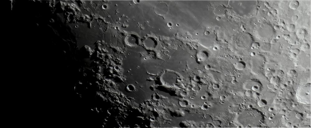 A panorama of the Moon in the region of Palus Epidemiarum, four clips of 3 minutes each at 25 fps (approximately 4500 frames per clip). The stacking rate was 15-20%.