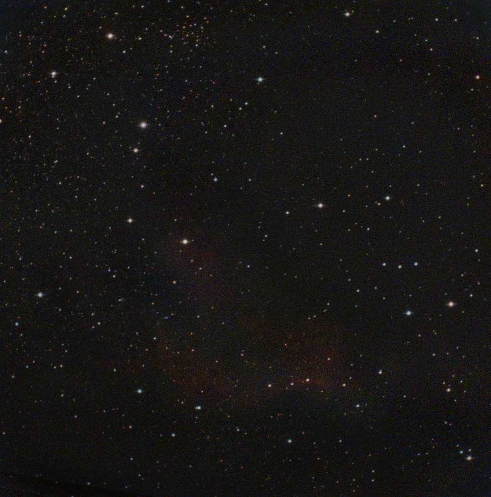The lens is used without a corrector and is mounted via a 1mm thick adapter, resulting in a relative aperture of about f/5.6. The camera lacks an IR filter. The sky is bright, and the session started around 2 a.m.