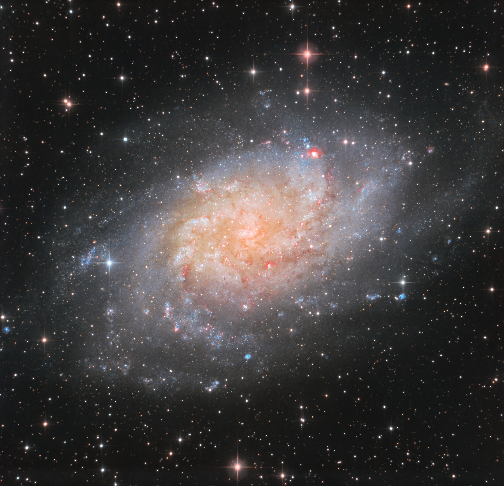 M33 - TRIANGULUM GALAXY Telescope/Lens: Sky-Watcher 130/650 PDS Camera: SVBONY SV605CC Mount: Juwei 17-100 Guide Scope: SVBONY SV106 Guide Camera: SVBONY SV305C Software: Siril, GraXpert, GIMP, Starnet++, Cosmic Clarity Accessories: SVBONY CLS Chekhov, Russia Light Pollution: Orange zone Exposure: 273 x 180" ISO/Gain: 101 Another processing of the stars allowed to preserve the "graininess" on the galaxy's arms and the stars on top of it. I hope this is the final processing :) Original size: https://deepskyhosting.com/O8as5vr Author: Buzzard