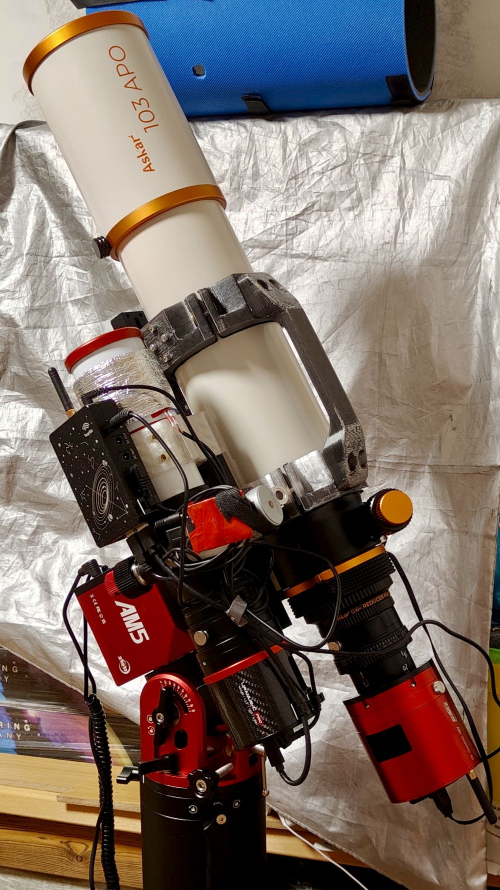 The only place to mount the second telescope (Sharpstar 50EDPH + 0.84 Reducer) on the Askar 103APO was the top handle, but that created a very long lever arm, with the second tube and accessories weighing 2kg. I printed two new rings and a handle, mounting the tube from the bottom side. I like this much better, and most importantly, the load on the RA axis drive is reduced.