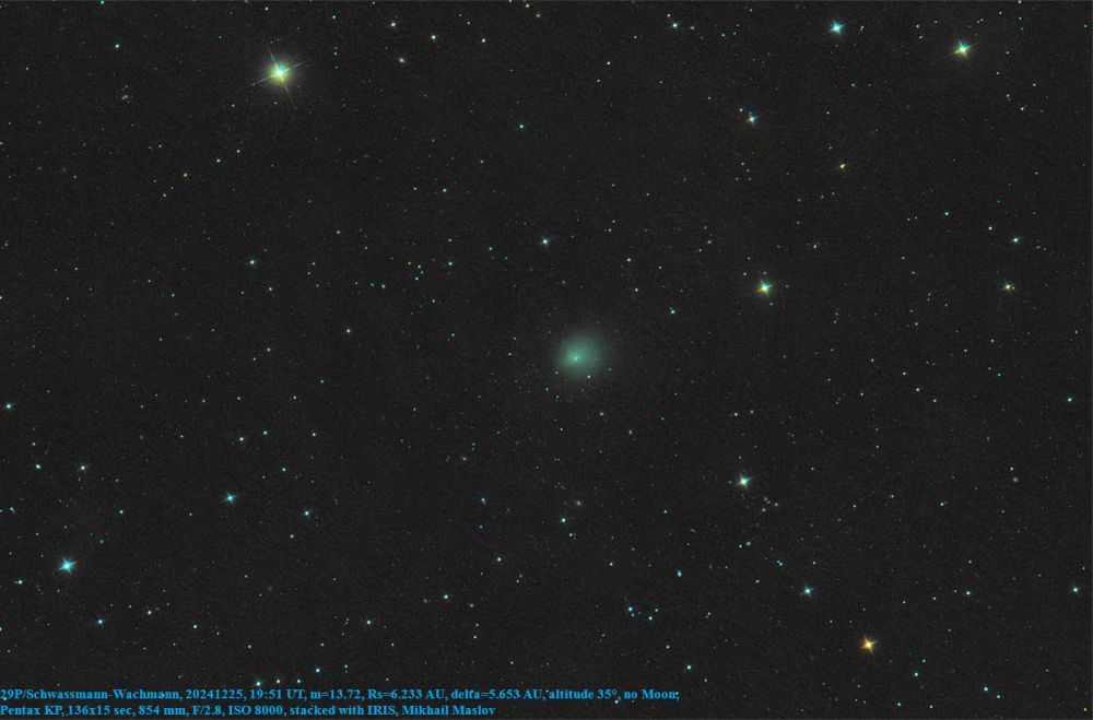 29P/SCHWASSMANN-WACHMANN Telescope/Lens: Newtonian 1200mm F/4.0 Camera: Pentax KP Mount: AZ-EQ6 Software: Iris Accessories: ASA corrector-reducer to 854 mm F/2.8 Novosibirsk, Russia Exposure: 136 x 15" ISO/Gain: 8000 Original size: https://deepskyhosting.com/Ob7fHth Author: Mikhail Maslov