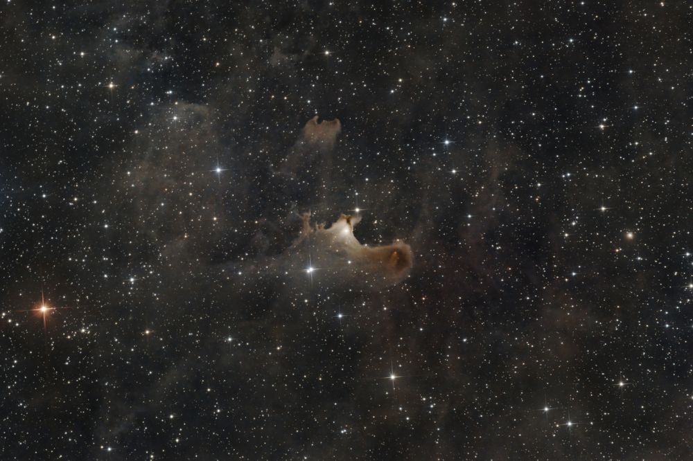This interstellar field, rich with stars and dust, is located in the constellation Cepheus. It is filled with clouds reflecting starlight, within the plane of the Milky Way. The Ghost Nebula is visible at the center of the image. Two dark, translucent, human-like figures appear to be raising their hands upward. Its size is more than two light-years, and it is brighter than other ghostly apparitions. Inside the reflection nebula, there are signs of dense, contracting condensations. These likely represent early stages of star formation.