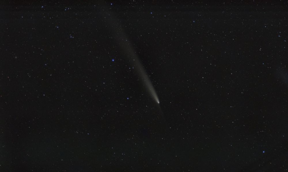 Comet C2023 A3 (Zijinshan-Atlas) October 19, 2024. Shot on Nikon D5300 through a Tamron 70-300mm lens (at 70mm). Stacked 140 frames of 6 seconds each, iso 1600, f4. Orange light pollution area, turning to red from the west. The photo has a small crop.
