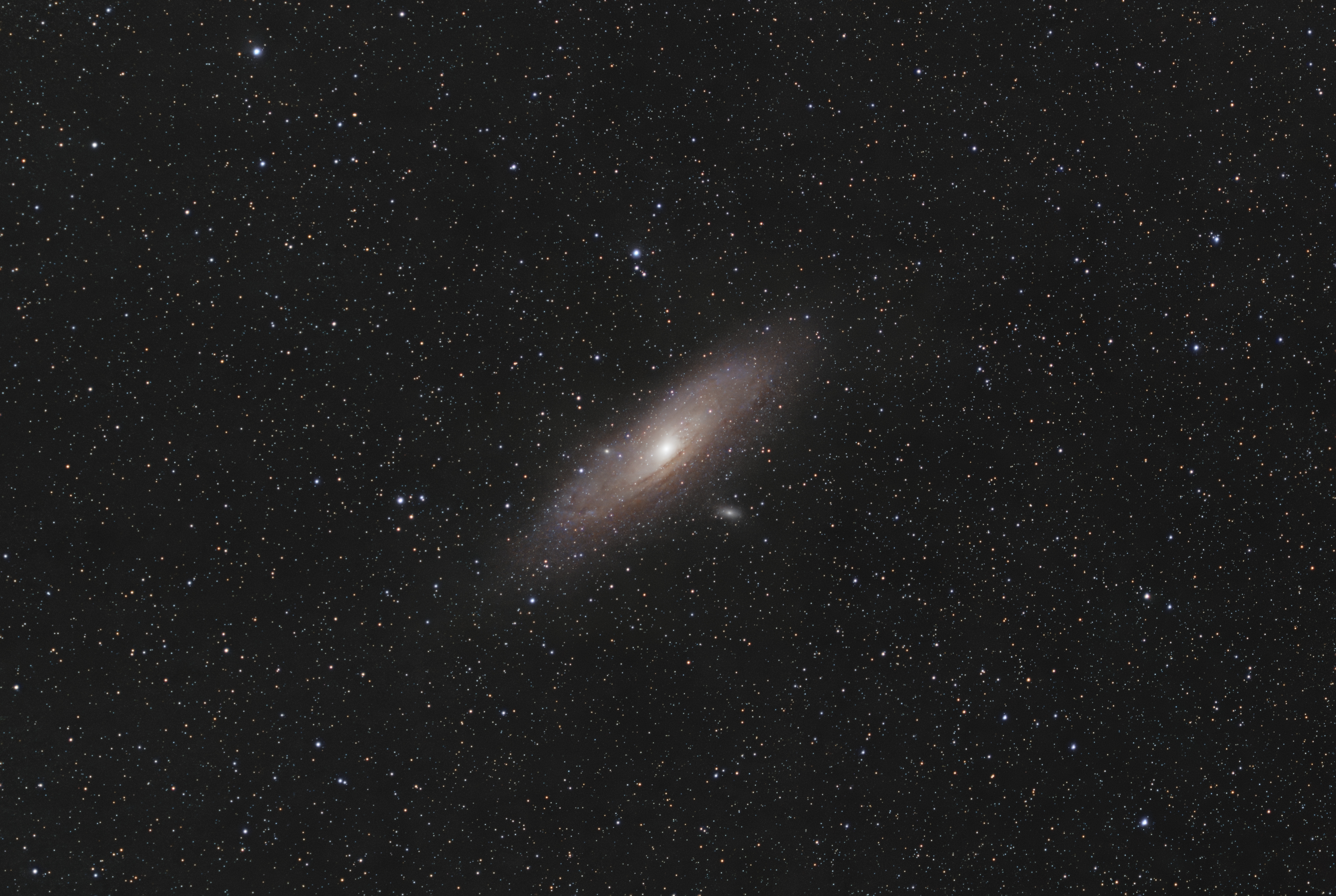 ANDROMEDA GALAXY (M31) Telescope/Lens: Jupiter-37A 135mm Camera: canon 450d Mount: Sky-Watcher EQ 2 + часовой привод Software: Siril, GraXpert, PixInsight Ardatov, Russia Light Pollution: Green zone Exposure: 99 x 20" ISO/Gain: 400 My first photo with tracking, actually it was supposed to be a test stack and I didn't expect such a result.