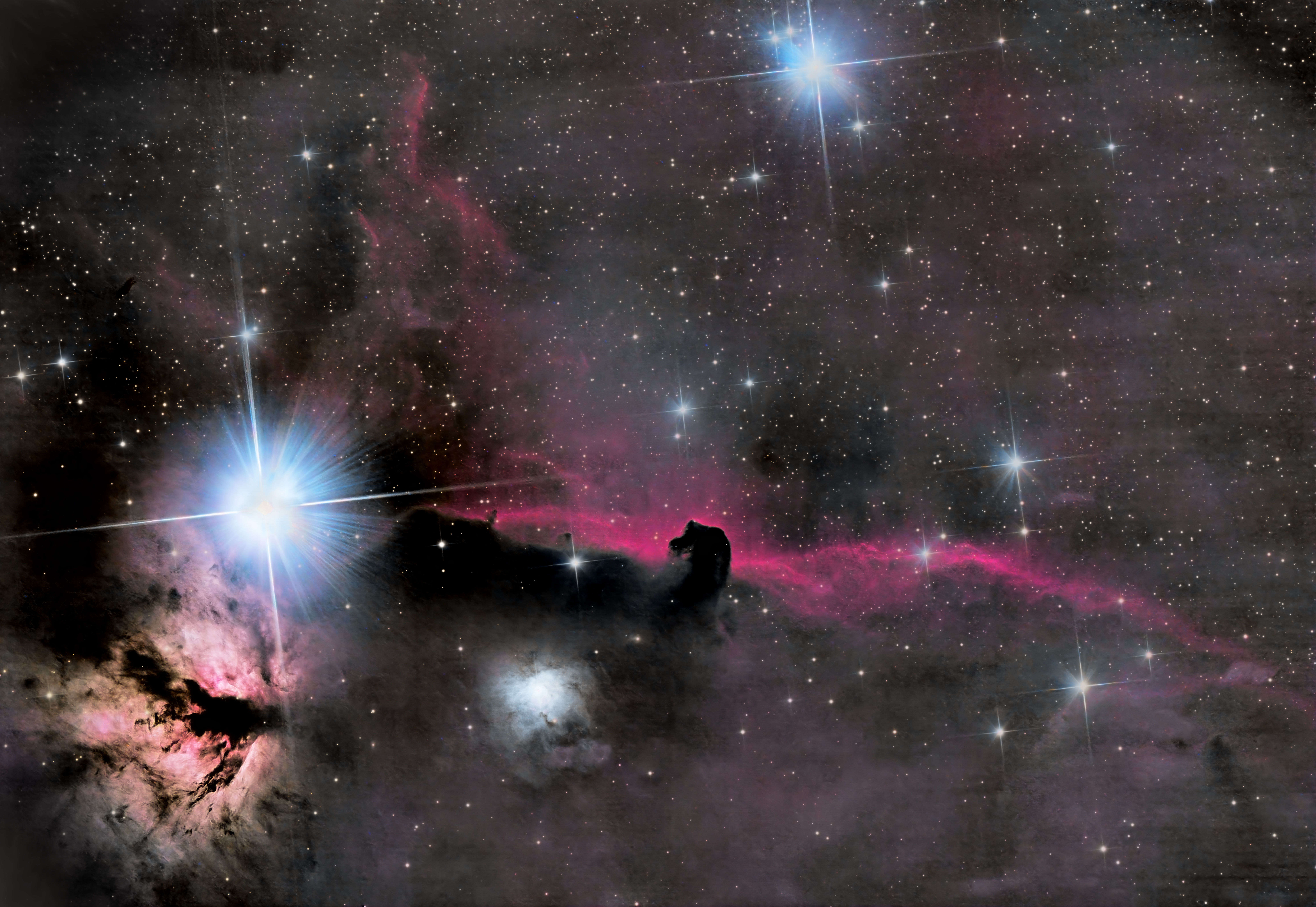 Several remarkable objects can be seen in this image: IC 434, which refers to the nebula behind Barnard 33, the Horsehead Nebula (which is a dark nebula), but also NGC 2023 (the small blue reflection nebula below the Horsehead) and NGC 2024 (the Flame Nebula), illuminated by the blue supergiant star Alnitak (one of the 3 stars in Orion's belt).