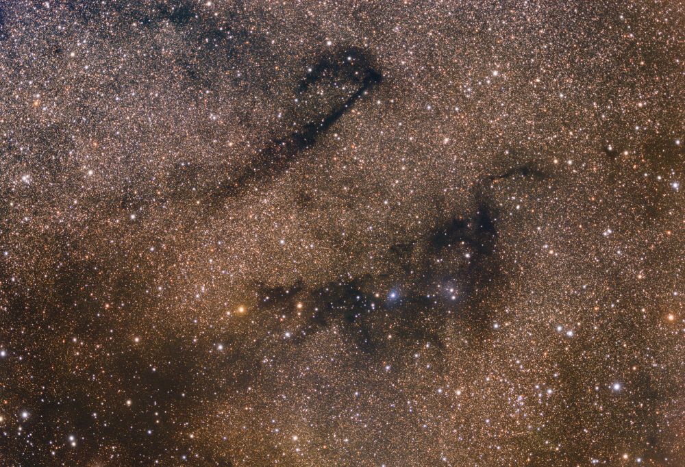 In this section of the Milky Way, covering an area of about 4×2.5 degrees in the constellation Vulpecula, you can see a pair of large dark nebulae that absorb the light of stars behind them—the Cane (at the top of the frame) and Nessie, or the Loch Ness Monster (below). The group of brighter white stars at the lower right is the open cluster NGC 6793. Around the bright star to the right and below the center of the frame, a small blue reflection nebula, vdB 126, is visible.
