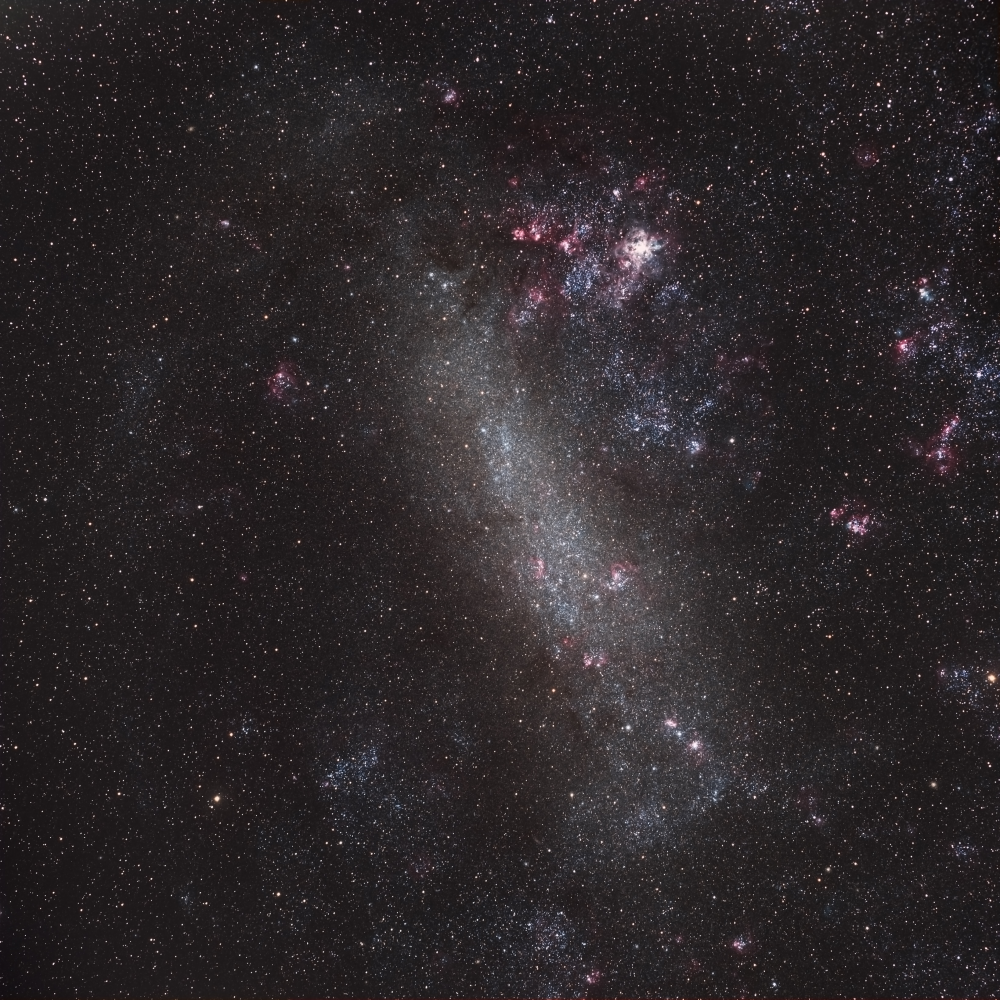 The Large Magellanic Cloud (LMC) is a dwarf galaxy of type SBm, a satellite of the Milky Way, located at a distance of about 163,000 light-years from our Galaxy. This distance is roughly equivalent to the diameter of our Galaxy. It belongs to the class of Magellanic irregular galaxies. The Milky Way and the Large Magellanic Cloud are expected to collide in approximately 2.4 billion years.
