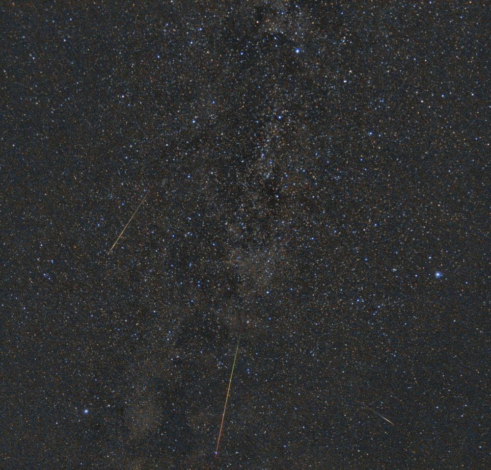 August has begun—the Perseids are coming soon! This photo was taken in the past, in 2019. Meteors in the Summer Triangle. Two fairly bright and colorful Perseids streaked from top to bottom, moving from Deneb toward Altair, while Vega remained in the frame to the right of these meteors. In the lower right corner, another meteor trail is visible; it does not belong to the Perseids and most likely comes from another meteor shower—the Delta Aquariids.