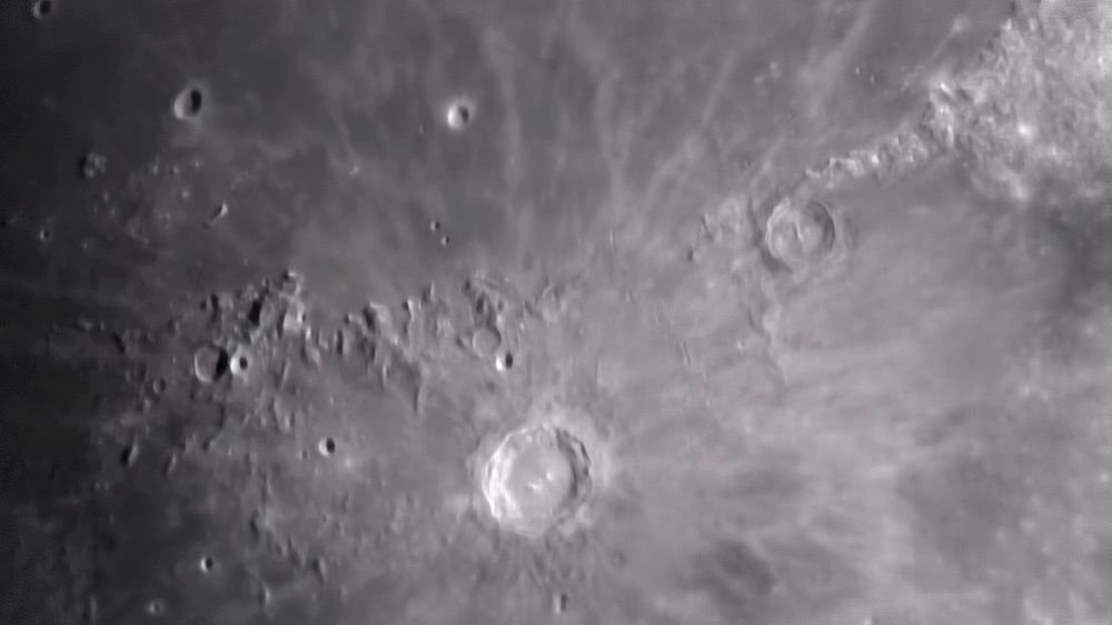 The Moon. Craters Copernicus (below center) and Eratosthenes (above and to the right of Copernicus). Copernicus has a diameter of 96 km, while Eratosthenes is 59 km in diameter. Above Copernicus are the Carpathian Mountains, and from Eratosthenes, the Apennine Mountains stretch to the northeast.