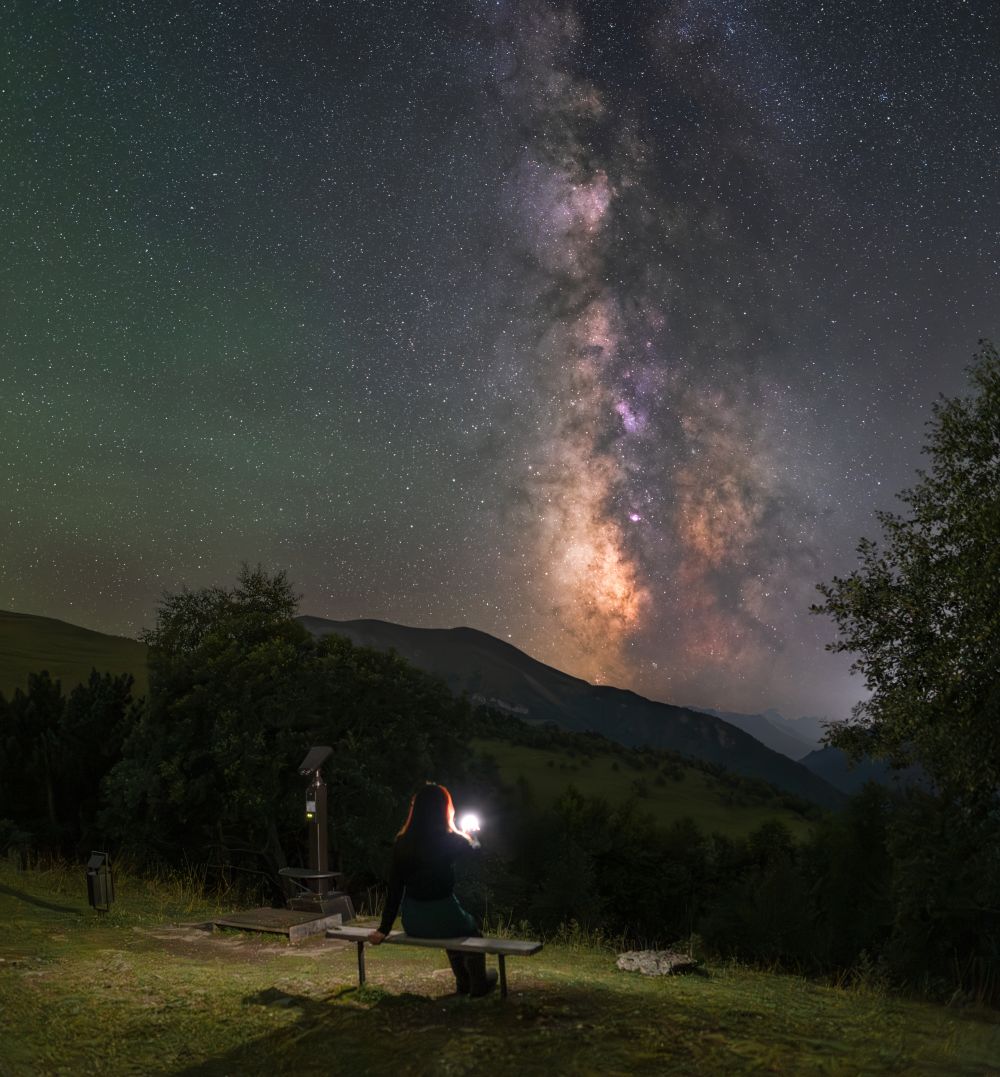 CONTEMPLATING THE STARRY SKY Telescope/Lens: Sigma 24mm f/1.4 Art DG HSM Camera: Canon R8 Mount: Штатив Software: Lightroom, Sequator, PTGui, StarNet2, Photoshop Arkhyz, Russia Sky: 10 x 8s, iso-6400, f2